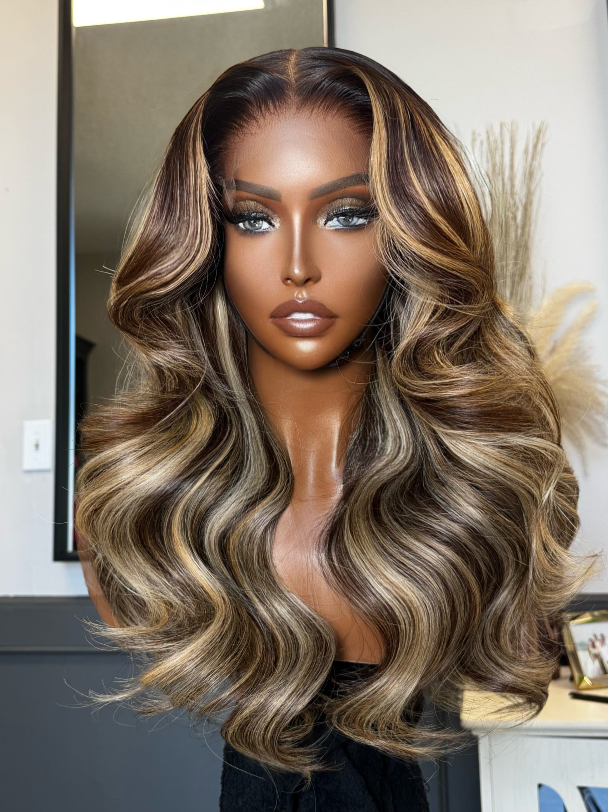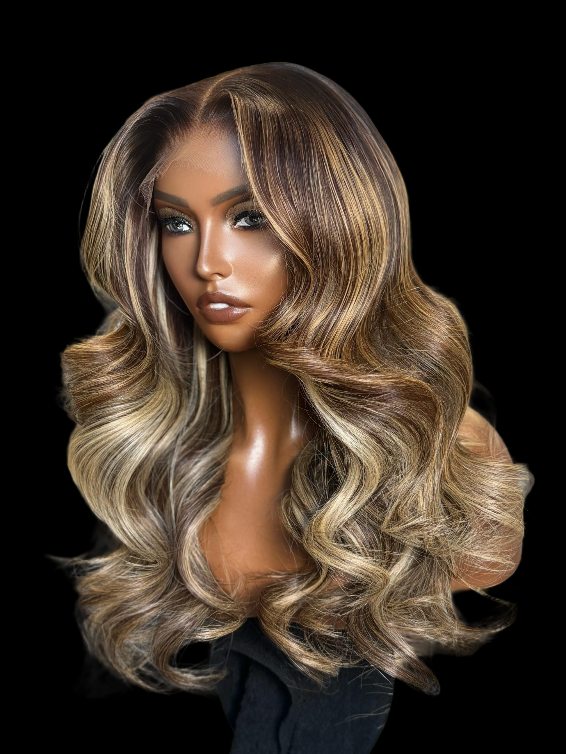 Chocolate brown with creamy ash+beige blonde highlights throughout